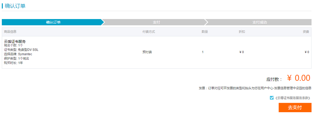 支付成功之后,去阿里云控制台,选择菜安全(云盾)->证书服务,可以找到刚刚的购买好的订单。